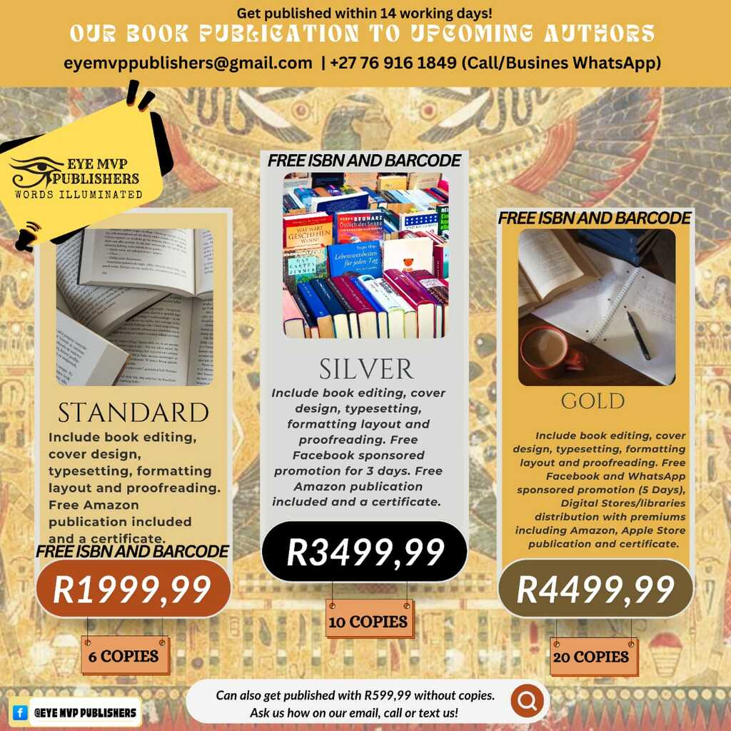Our R599,99 package offers comprehensive services, including cover design, layout editing, and typesetting. Please note that this special does not cover printed books or proofreading. Enhance your project with our expert design solutions today!